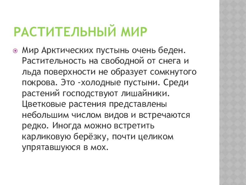 и льда поверхности не образует сомкнутого покрова. Это -холодные пустыни. Среди растений господствуют лишайники. Цветковые растения представлены небольшим числом видов и встречаются редко. Иногда можно встретить карликовую берёзку, почти целиком упрятавшуюся в мох.