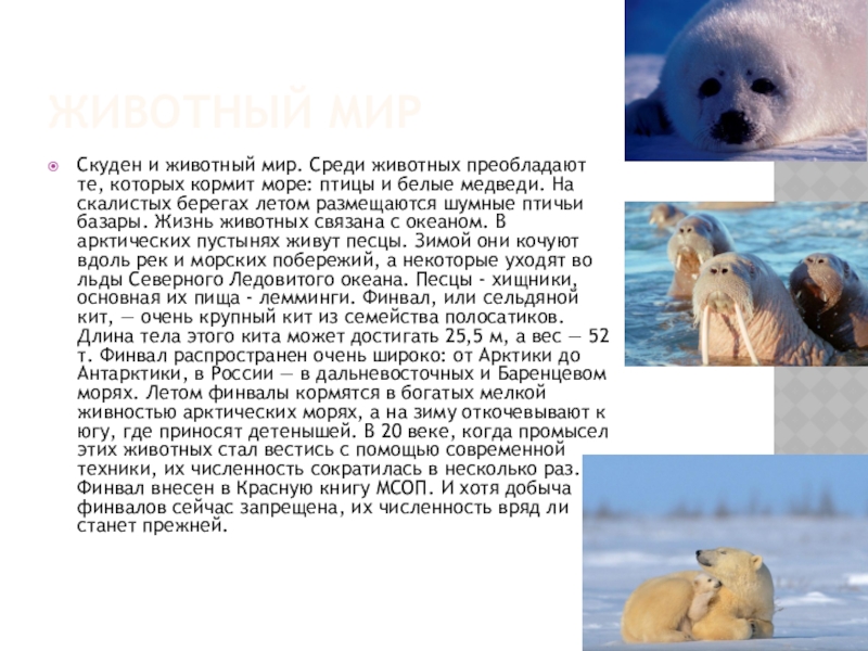 море: птицы и белые медведи. На скалистых берегах летом размещаются шумные птичьи базары. Жизнь животных связана с океаном. В арктических пустынях живут песцы. Зимой они кочуют вдоль рек и морских побережий, а некоторые уходят во льды Северного Ледовитого океана. Песцы - хищники, основная их пища - лемминги. Финвал, или сельдяной кит, — очень крупный кит из семейства полосатиков. Длина тела этого кита может достигать 25,5 м, а вес — 52 т. Финвал распространен очень широко: от Арктики до Антарктики, в России — в дальневосточных и Баренцевом морях. Летом финвалы кормятся в богатых мелкой живностью арктических морях, а на зиму откочевывают к югу, где приносят детенышей. В 20 веке, когда промысел этих животных стал вестись с помощью современной техники, их численность сократилась в несколько раз. Финвал внесен в Красную книгу МСОП. И хотя добыча финвалов сейчас запрещена, их численность вряд ли станет прежней.