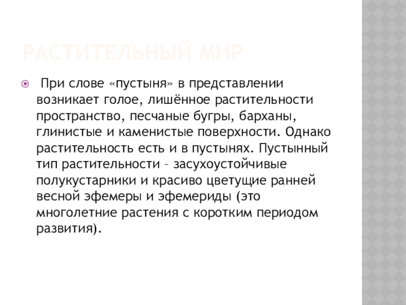 песчаные бугры, барханы, глинистые и каменистые поверхности. Однако растительность есть и в пустынях. Пустынный тип растительности – засухоустойчивые полукустарники и красиво цветущие ранней весной эфемеры и эфемериды (это многолетние растения с коротким периодом развития).