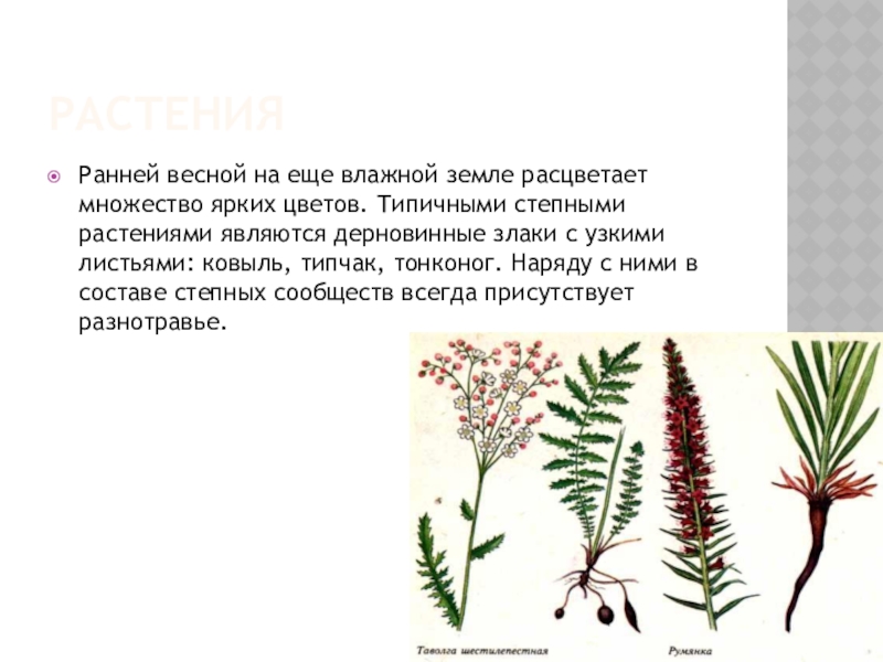 степными растениями являются дерновинные злаки с узкими листьями: ковыль, типчак, тонконог. Наряду с ними в составе степных сообществ всегда присутствует разнотравье.