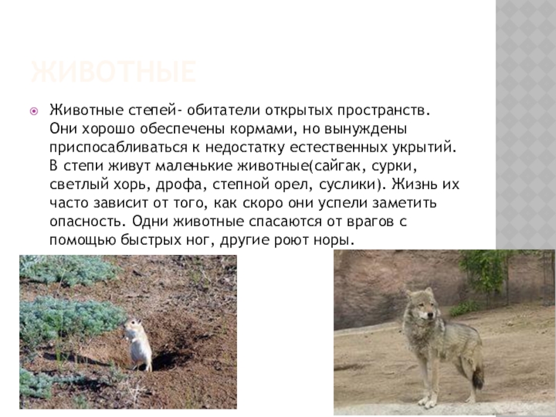 Животные степей- обитатели открытых пространств. Они хорошо обеспечены кормами, но вынуждены