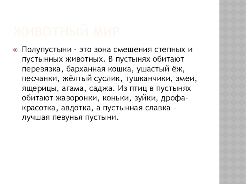 Полупустыни - это зона смешения степных и пустынных животных. В
