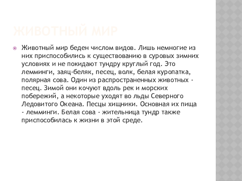 к существованию в суровых зимних условиях и не покидают тундру круглый год. Это лемминги, заяц-беляк, песец, волк, белая куропатка, полярная сова. Один из распространенных животных - песец. Зимой они кочуют вдоль рек и морских побережий, а некоторые уходят во льды Северного Ледовитого Океана. Песцы хищники. Основная их пища - лемминги. Белая сова - жительница тундр также приспособилась к жизни в этой среде.