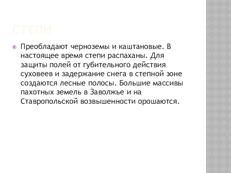 полей от губительного действия суховеев и задержание снега в степной зоне создаются лесные полосы. Большие массивы пахотных земель в Заволжье и на Ставропольской возвышенности орошаются.