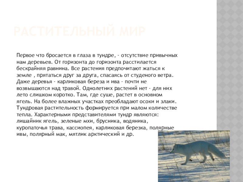 нам деревьев. От горизонта до горизонта расстилается бескрайняя равнина. Все растения предпочитают жаться к земле , прятаться друг за друга, спасаясь от студеного ветра. Даже деревья - карликовая береза и ива - почти не возвышаются над травой. Однолетних растений нет - для них лето слишком коротко. Там, где суше, растет в основном ягель. На более влажных участках преобладают осоки и злаки. Тундровая растительность формируется при малом количестве тепла. Характерными представителями тундр являются: лишайник ягель, зеленые мхи, брусника, водяника, куропаточья трава, кассиопея, карликовая березка, полярные ивы, полярный мак, мятлик арктический и др.