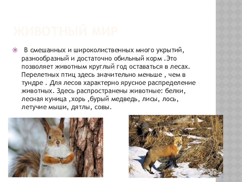 корм .Это позволяет животным круглый год оставаться в лесах. Перелетных птиц здесь значительно меньше , чем в тундре . Для лесов характерно ярусное распределение животных. Здесь распространены животные: белки, лесная куница ,хорь ,бурый медведь, лисы, лось, летучие мыши, дятлы, совы.