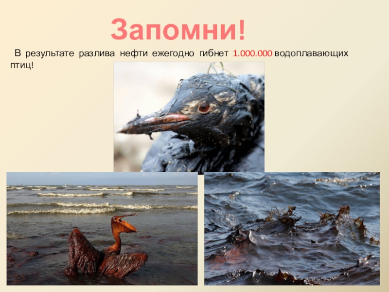 Запомни! В результате разлива нефти ежегодно гибнет 1.000.000 водоплавающих птиц!