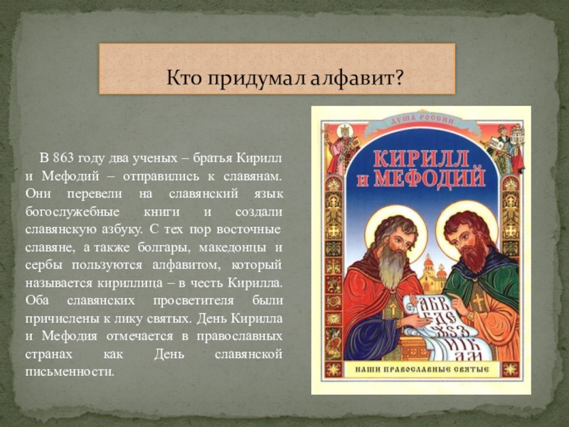 В 863 году два ученых – братья Кирилл и Мефодий – отправились к славянам. Они перевели на славянский язык богослужебные книги и создали славянскую азбуку. С тех пор восточные славяне, а также болгары, македонцы и сербы пользуются алфавитом, который называется кириллица – в честь Кирилла. Оба славянских просветителя были причислены к лику святых. День Кирилла и Мефодия отмечается в православных странах как День славянской письменности.
