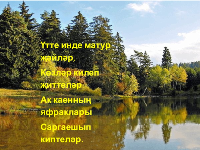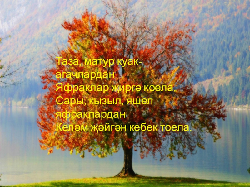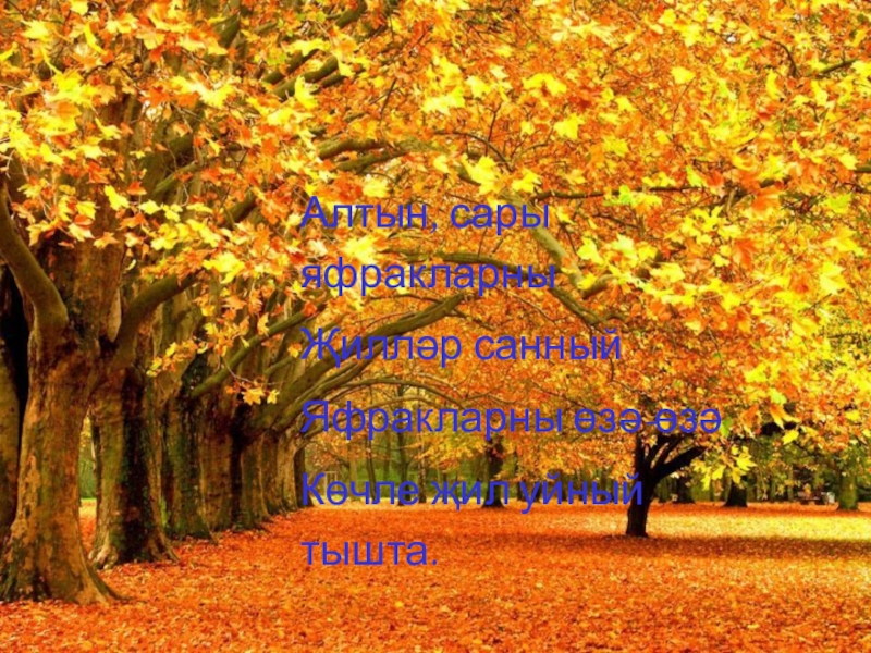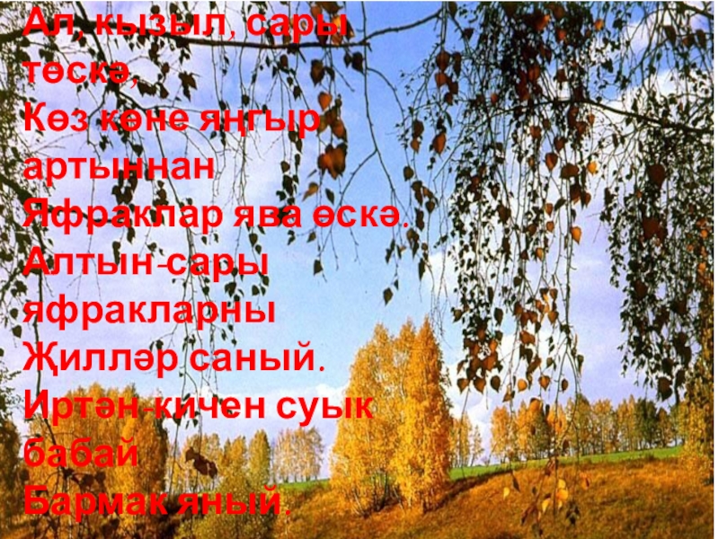 Слайд 13Таза, матур куак-агачлардан Яфраклар җиргә коела. Сары, кызыл, яшел яфраклардан Келәм җәйгән кебек тоела.