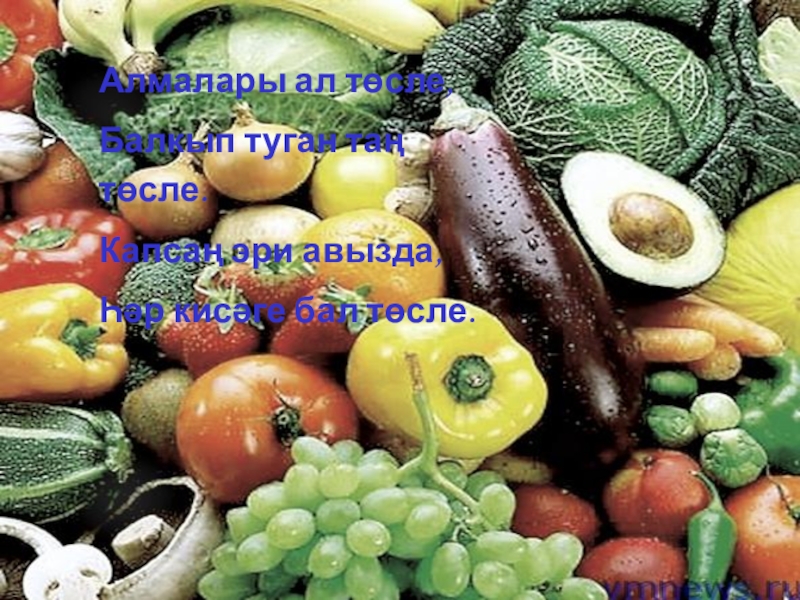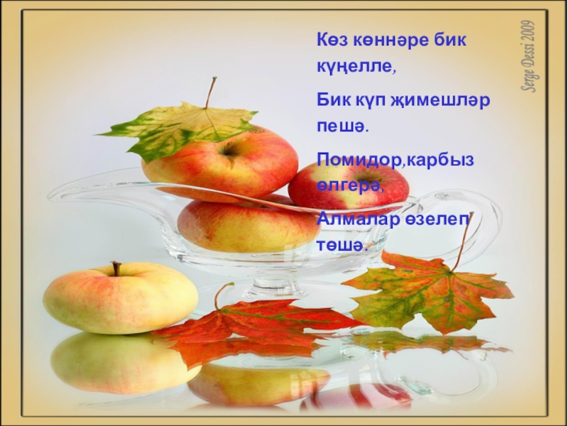 Көз көннәре бик күңеллеБик күп җимешләр пешәПомидор, карбыз өлгерәАлмалар өзелеп төшә.