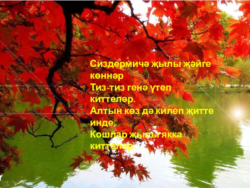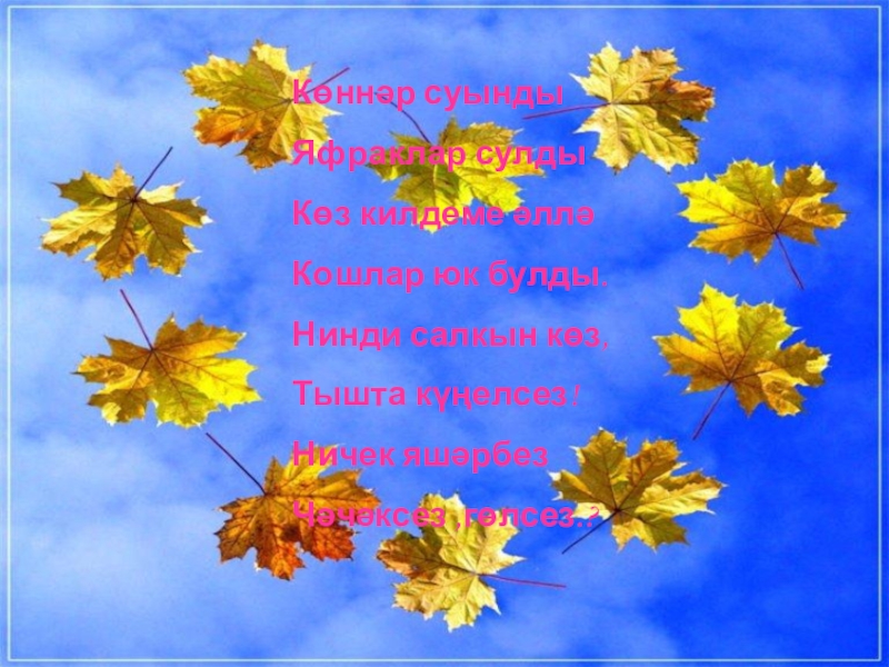 Слайд 12Сиздермичә җылы җәйге көннәр Тиз-тиз генә үтеп киттеләр. Алтын көз дә килеп җитте