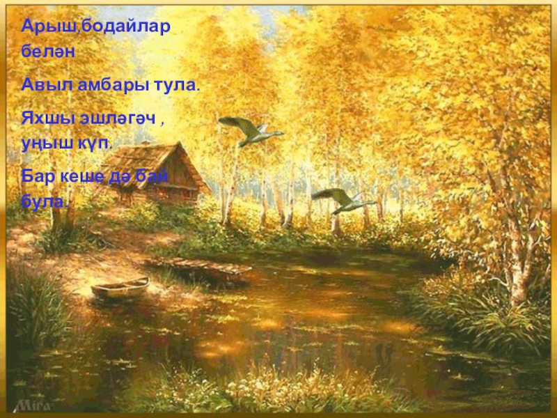 Сиздермичә җылы җәйге көннәр Тиз-тиз генә үтеп киттеләр. Алтын көз дә килеп җитте инде, Кошлар җылы якка