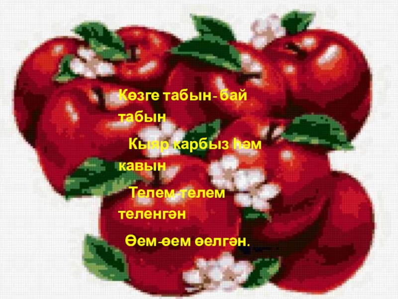 Алмалары ал төсле,Балкып туган таң төсле.Капсаң эри авызда,Һәр кисәге бал төсле.
