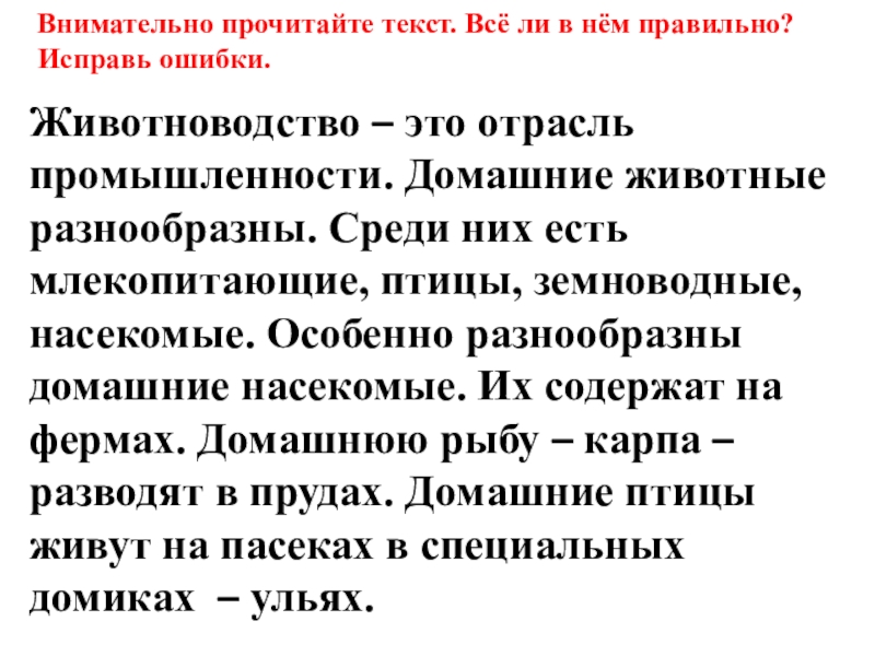Животноводство – это отрасль промышленности. Домашние животные разнообразны. Среди них есть млекопитающие, птицы, земноводные, насекомые. Особенно разнообразны домашние насекомые. Их содержат на фермах. Домашнюю рыбу – карпа – разводят в прудах. Домашние птицы живут на пасеках в специальных