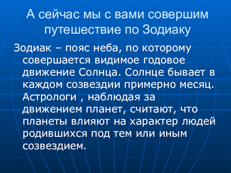 Слайд 19А сейчас мы с вами совершим путешествие по Зодиаку