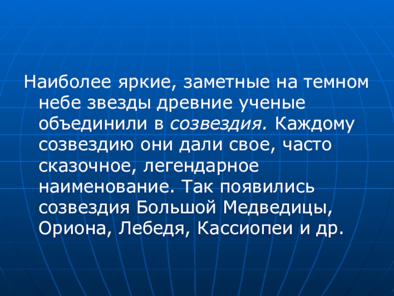 Наиболее яркие, заметные на темном небе звезды древние ученые объединили в созвездия. Каждому созвездию они дали свое,