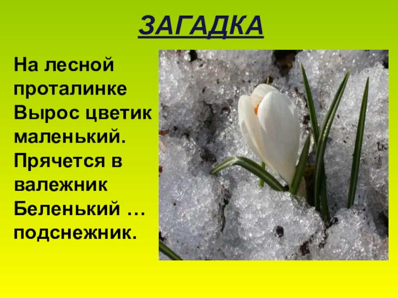 ЗАГАДКАНа лесной проталинке Вырос цветик маленький. Прячется в валежник Беленький …подснежник.