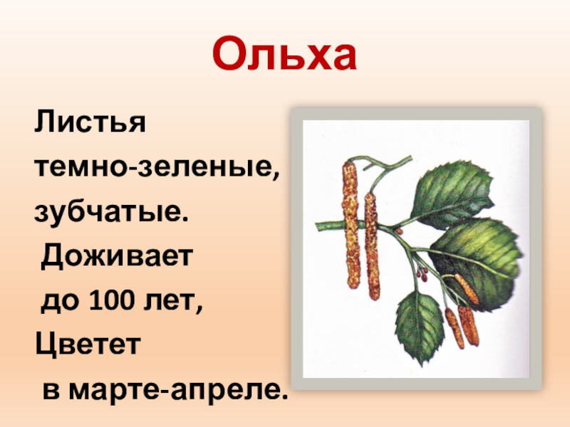 ОльхаЛистья темно-зеленые, зубчатые. Доживает до 100 лет, Цветет в марте-апреле.
