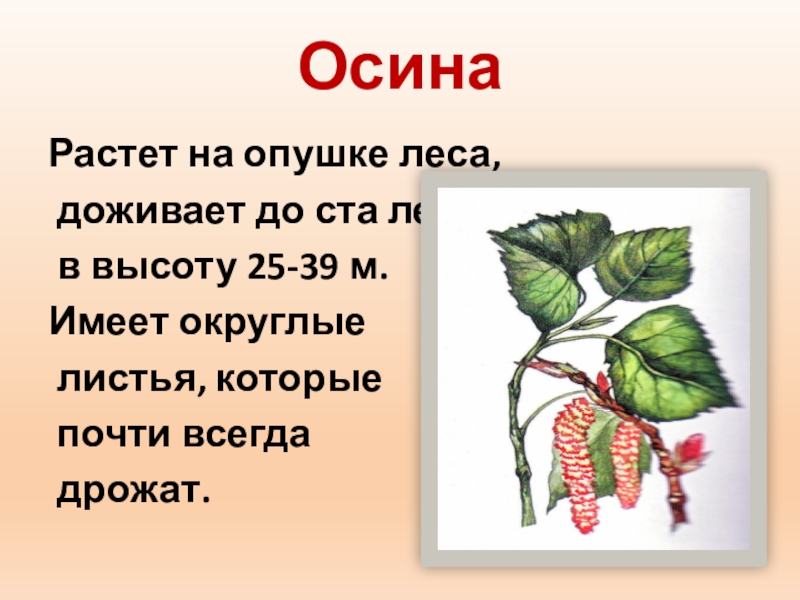 ОсинаРастет на опушке леса, доживает до ста лет в высоту 25-39 м.Имеет округлые листья, которые почти всегда
