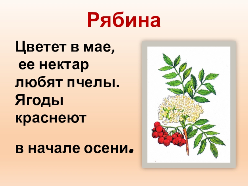 РябинаЦветет в мае, ее нектар любят пчелы.Ягоды краснеютв начале осени.