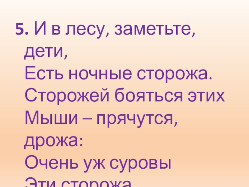 5. И в лесу, заметьте, дети,  Есть ночные сторожа. Сторожей бояться этих Мыши – прячутся,