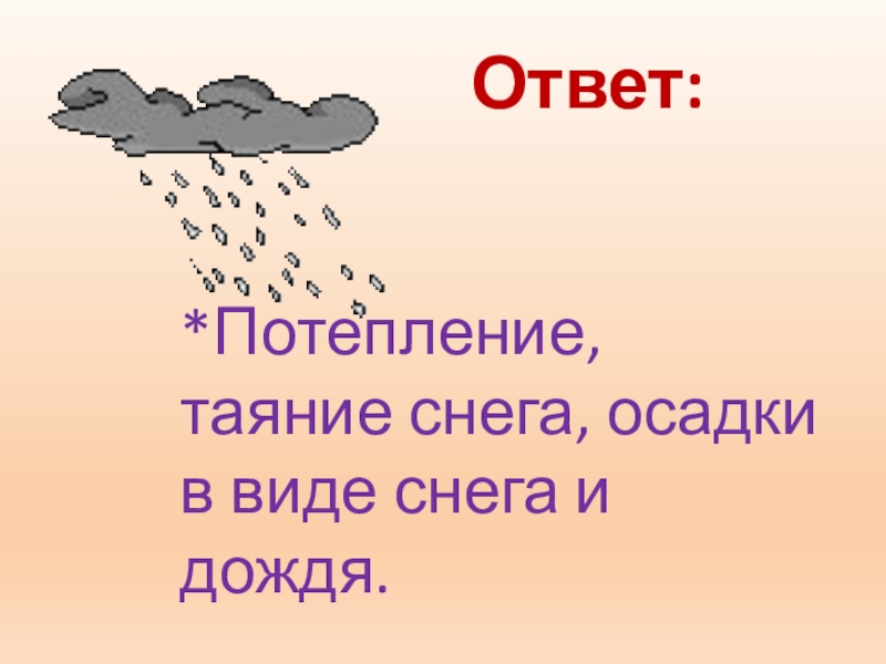 Ответ:         *Потепление, таяние снега, осадки в виде снега и