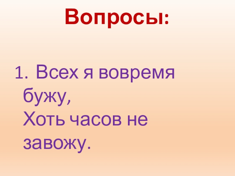 Вопросы: 1.  Всех я вовремя бужу,  Хоть часов не завожу.