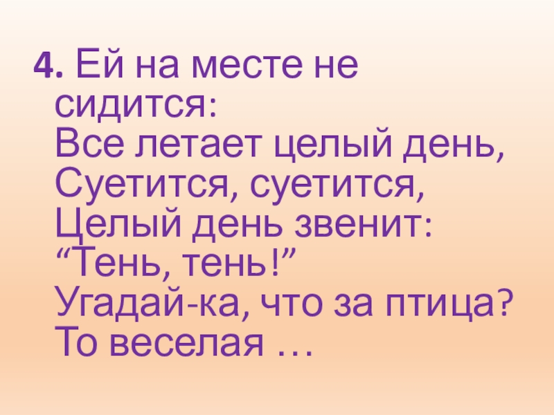 4. Ей на месте не сидится: Все летает целый день, Суетится, суетится, Целый день звенит: “Тень, тень!” Угадай-ка,