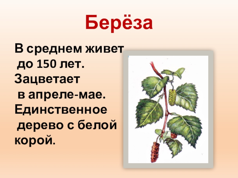 БерёзаВ среднем живет до 150 лет. Зацветает в апреле-мае.Единственное дерево с белой корой.