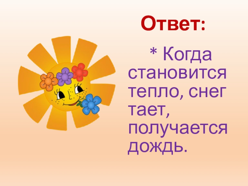 Ответ:    * Когда становится тепло, снег тает, получается дождь.