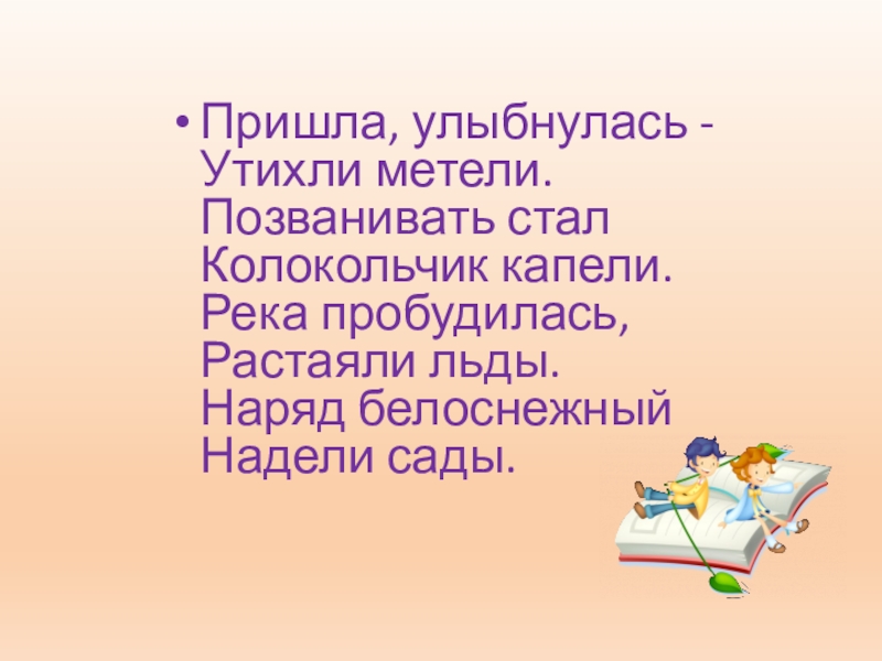 Пришла, улыбнулась - Утихли метели. Позванивать стал Колокольчик капели. Река пробудилась, Растаяли льды. Наряд белоснежный Надели сады.