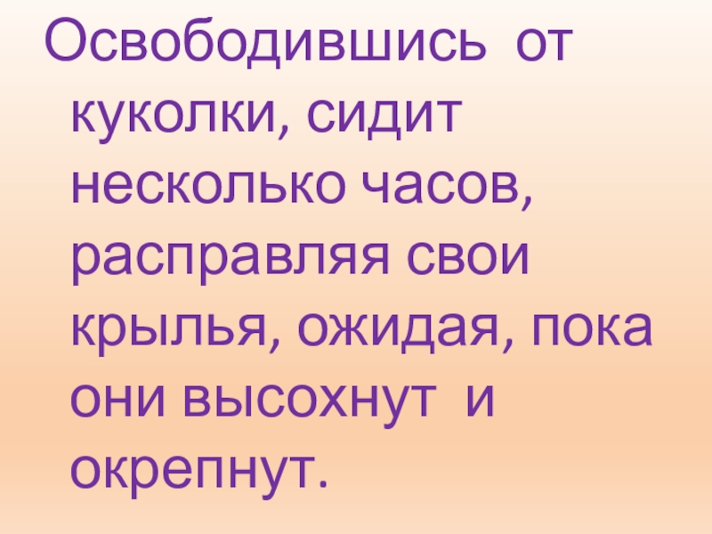 Освободившись от куколки, сидит несколько часов, расправляя свои крылья, ожидая, пока