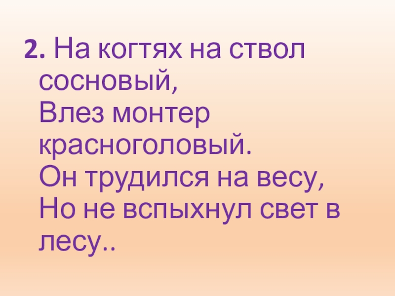 2. На когтях на ствол сосновый, Влез монтер красноголовый. Он трудился на весу,  Но не вспыхнул свет в