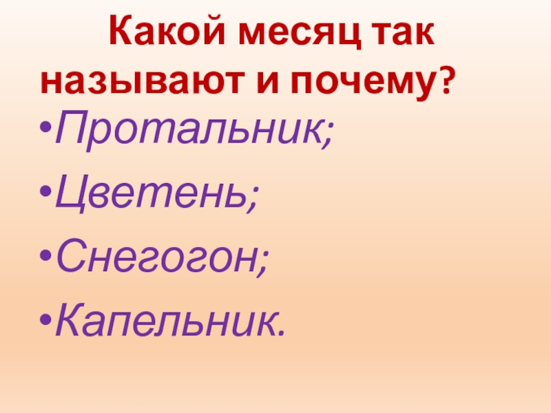 Какой месяц так называют и почему?Протальник;Цветень;Снегогон;Капельник.