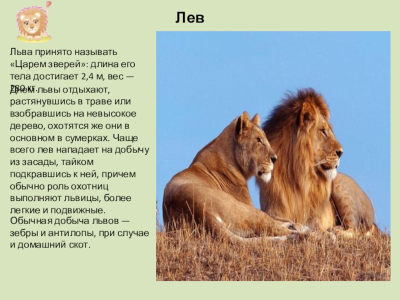 Днем львы отдыхают, растянувшись в траве или взобравшись на невысокое дерево, охотятся же они в основном в сумерках. Чаще всего лев нападает на добычу из засады, тайком подкравшись к ней, причем обычно роль охотниц выполняют львицы, более легкие и подвижные.