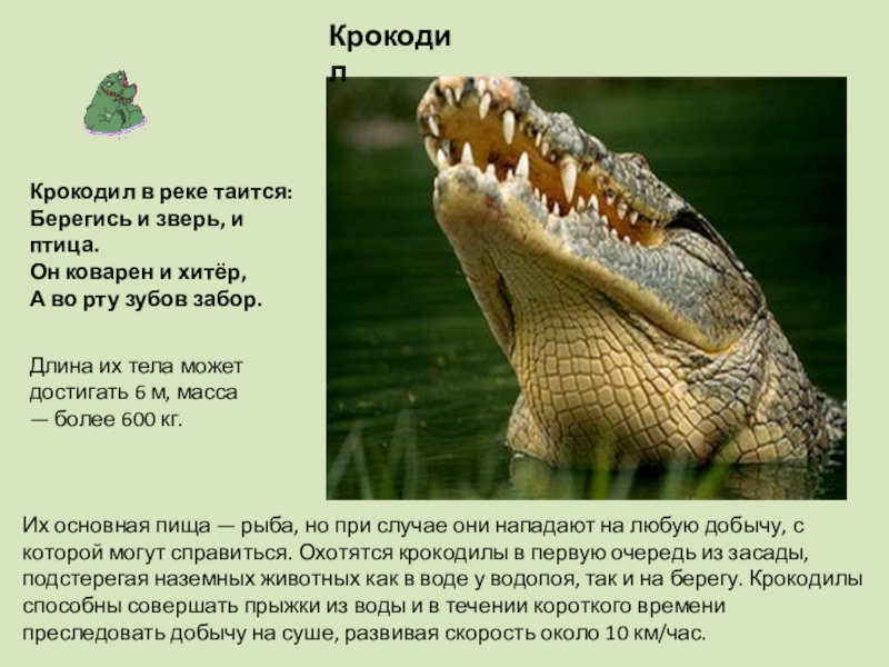 Их основная пища — рыба, но при случае они нападают на любую добычу, с которой могут справиться. Охотятся крокодилы в первую очередь из засады, подстерегая наземных животных как в воде у водопоя, так и на берегу. Крокодилы способны совершать прыжки из воды и в течении короткого времени преследовать добычу на суше, развивая скорость около 10 км/час.