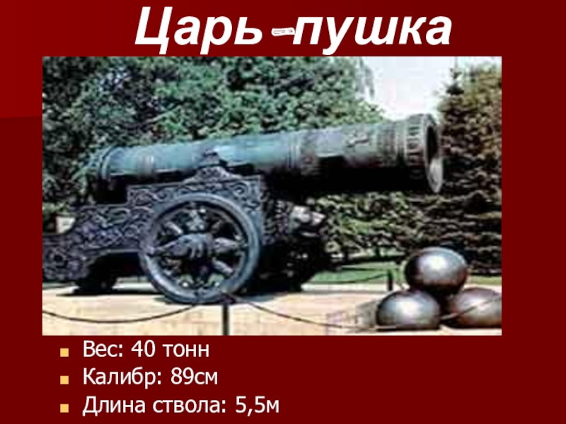 Царь-пушкаВес: 40 тоннКалибр: 89смДлина ствола: 5,5м
