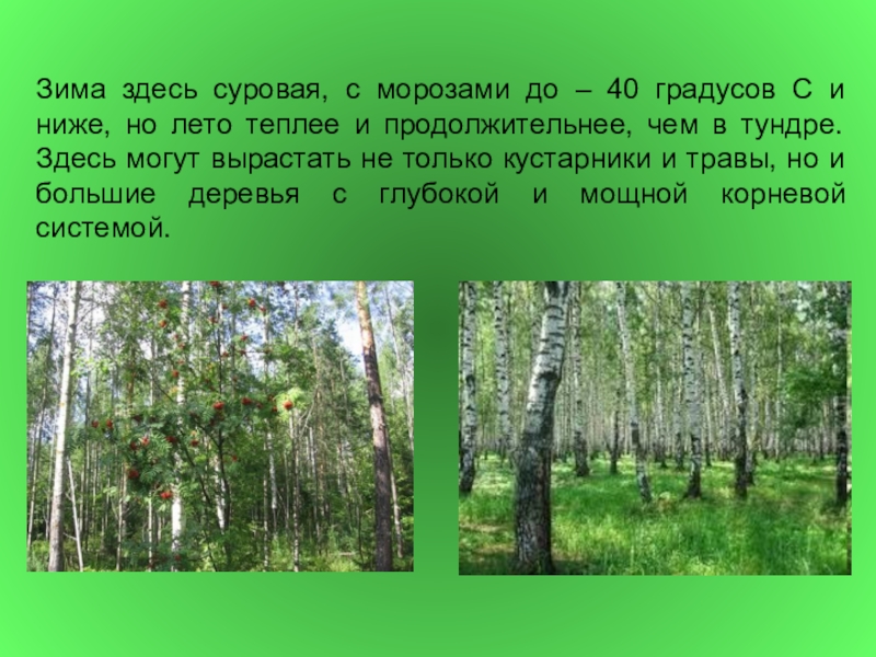 ниже, но лето теплее и продолжительнее, чем в тундре. Здесь могут вырастать не только кустарники и травы, но и большие деревья с глубокой и мощной корневой системой.