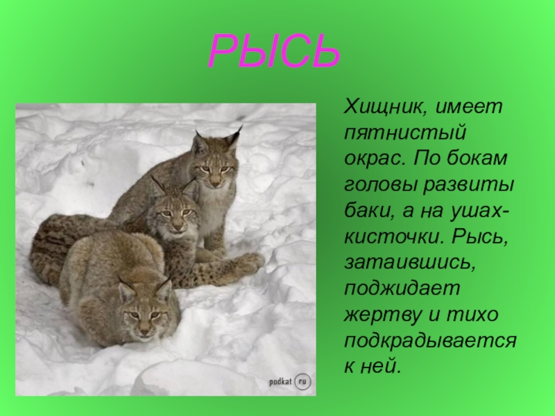 головы развиты баки, а на ушах- кисточки. Рысь, затаившись, поджидает жертву и тихо подкрадывается к ней.