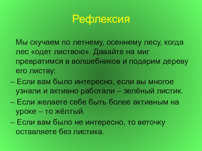 – Если вам было интересно, если вы многое узнали и активно работали – зелёный листик.