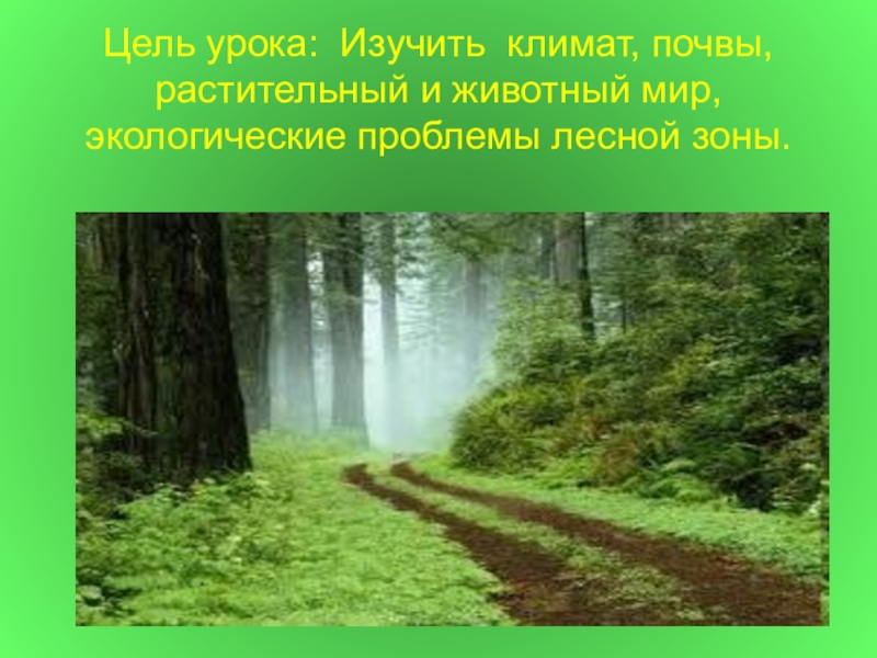 Слайд 7Цель урока: Изучить климат, почвы, растительный и животный мир, экологические проблемы