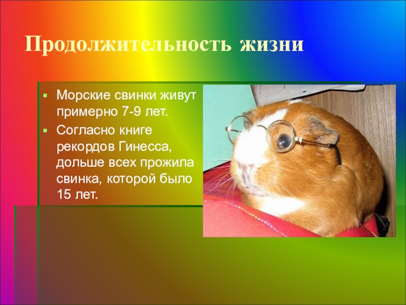 Продолжительность жизниМорские свинки живут примерно 7-9 лет. Согласно книге рекордов Гинесса, дольше всех прожила свинка, которой было