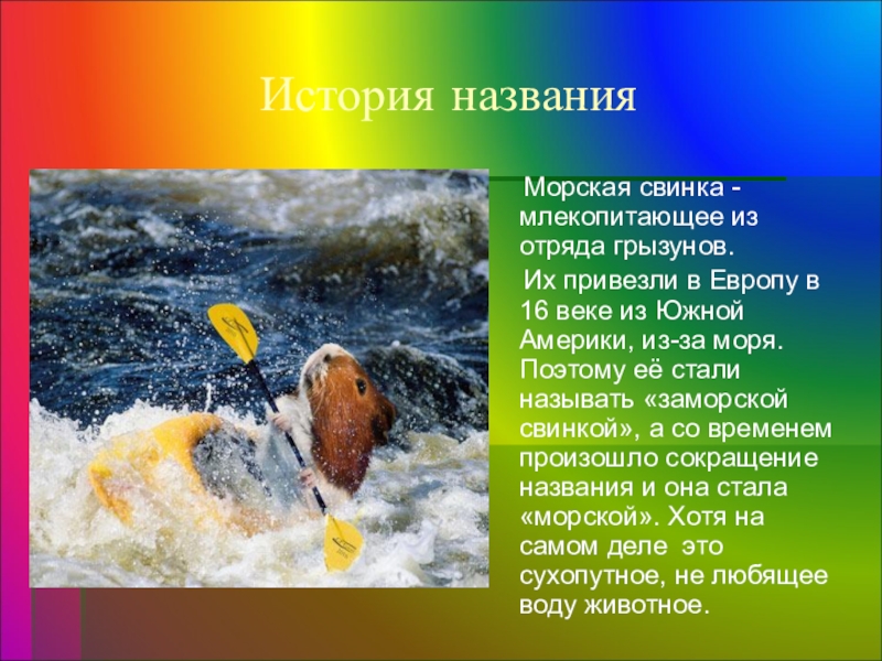 История названия   Морская свинка - млекопитающее из отряда грызунов.   Их привезли в Европу