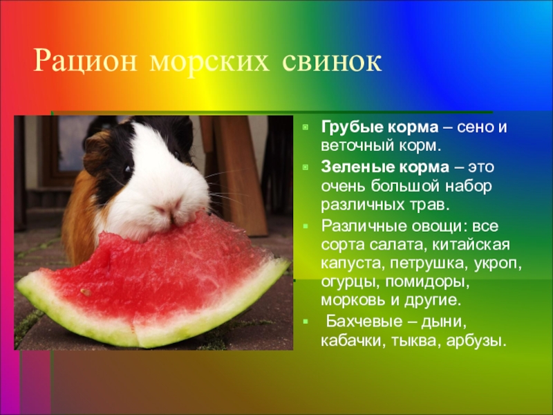 Рацион морских свинокГрубые корма – сено и веточный корм. Зеленые корма – это очень большой набор различных