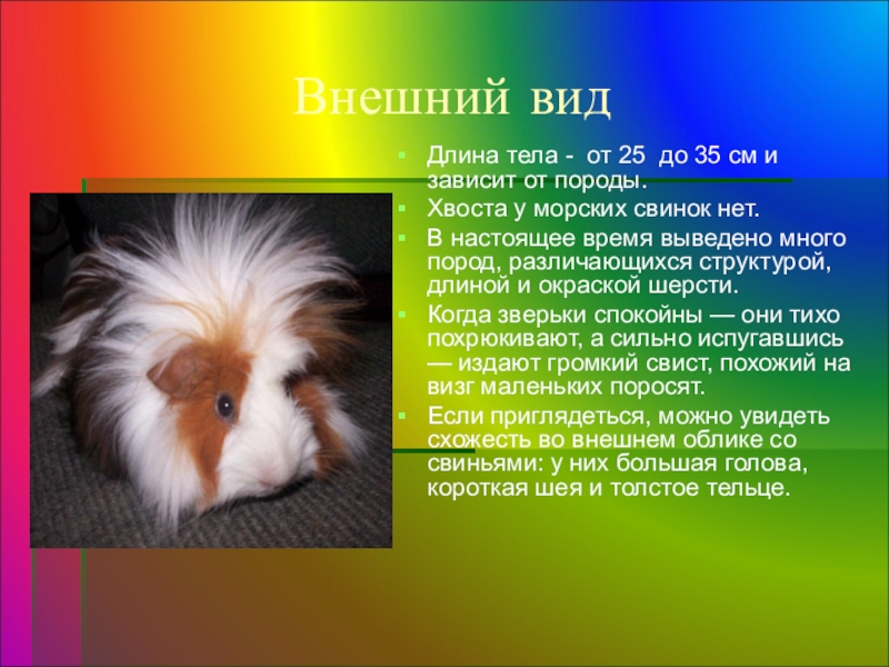 Внешний видДлина тела -  от 25  до 35 см и зависит от породы. Хвоста у морских свинок