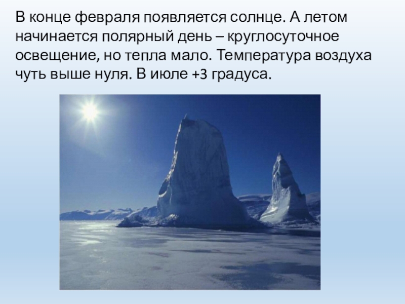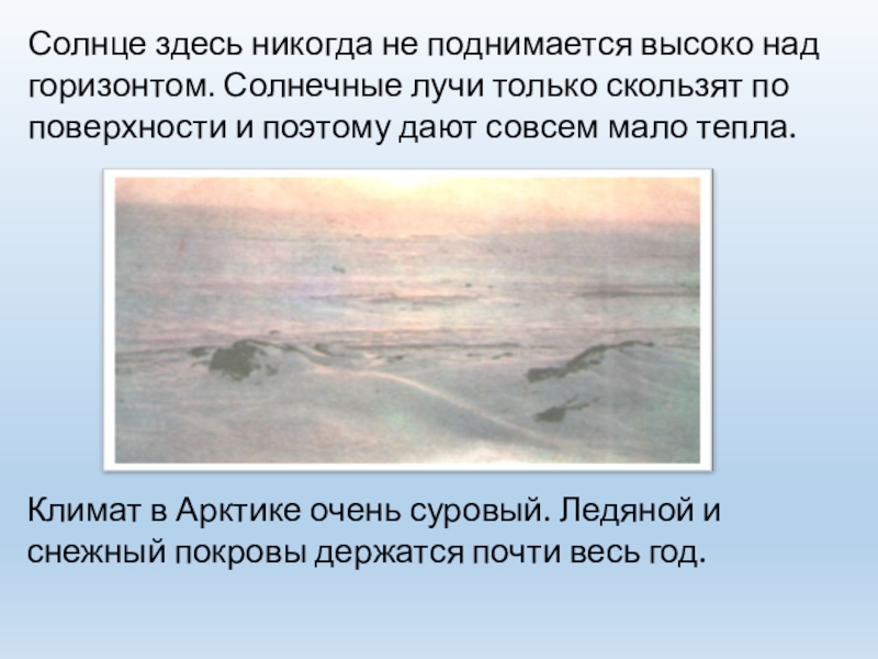 Солнце здесь никогда не поднимается высоко над горизонтом. Солнечные лучи только скользят по поверхности и поэтому дают совсем мало тепла.