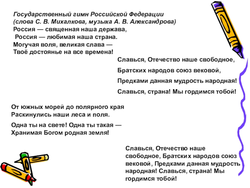 Славься, Отечество наше свободное, Братских народов союз вековой, Предками данная мудрость народная! Славься, страна! Мы гордимся тобой!