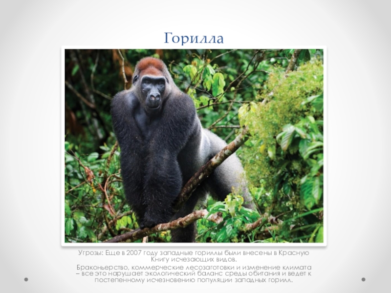 Угрозы: Еще в 2007 году западные гориллы были внесены в Красную
