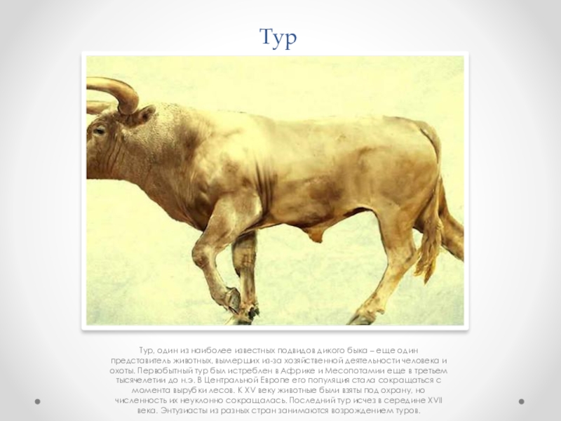 представитель животных, вымерших из-за хозяйственной деятельности человека и охоты. Первобытный тур был истреблен в Африке и Месопотамии еще в третьем тысячелетии до н.э. В Центральной Европе его популяция стала сокращаться с момента вырубки лесов. К XV веку животные были взяты под охрану, но численность их неуклонно сокращалась. Последний тур исчез в середине XVII века. Энтузиасты из разных стран занимаются возрождением туров.