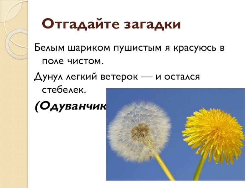 Отгадайте загадкиБелым шариком пушистым я красуюсь в поле чистом.Дунул легкий ветерок — и остался стебелек. (Одуванчик)